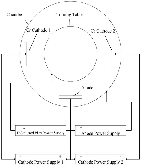 CrC and CrC/a-C:H films were prepared using a homemade PVD coating system. The dimension of the vacuum chamber was 800 mm in diameter and 900 mm in height, and the effective coating area was 650 mm in diameter and 500 mm in height. Two 600 × 120 mm2 chromium targets (99.95% pure) were positioned as the cathode. A water-cooled copper plate with the same size as the cathode was used as the anode. Three Advanced Energy Pinnacle 20K DC power supplies and a Pinnacle plus 10K DC-pulsed power supply were connected to the system (see Figure 1).