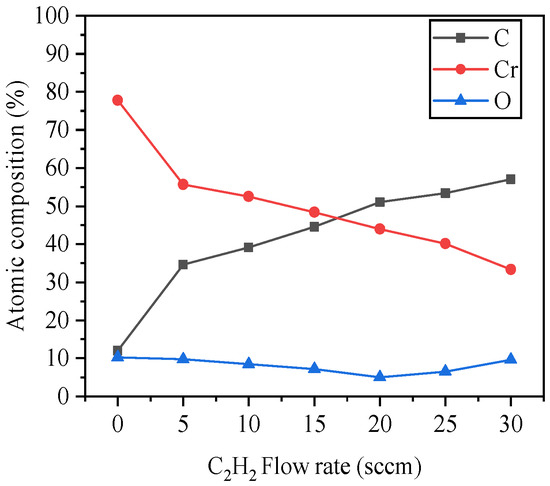 XPS spectra of the CrC films identified Cr, C and O presence (see Figure 2). As the C2H2 flow rate increased from 0 to 30 sccm, the C content of CrC samples increased from 12 to 57% while the Cr content decreased from 78 to 33%, and the O content remained below 10%. The CrC0 sample is designed as a pure Cr layer, but it contains 12% carbon and 8% oxygen according to XPS composition analysis. It may be that the sample was polluted by exposure to the environment. Moreover, as a calibration element of XPS analysis, C is an almost inevitable impurity.