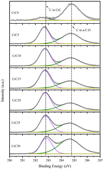 High-resolution C1s XPS spectra of CrC films deposited at different C2H2 flow rates revealed carbide peaks at 282.8 eV and carbon peaks at 284.8 eV (see Figure 3). There is only a carbon peak in the C1s XPS spectrum of the CrC0 sample, which shows that the C element of the CrC0 sample is surface contamination and does not bond with Cr. There are carbon peaks and carbide peaks in C1s XPS spectra of other samples.
