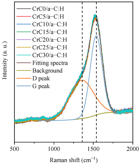 Raman spectra of the CrC/a-C:H films showed the typical asymmetric inclined patterns typical for amorphous carbon [14,24] (see Figure 5). The seven Raman scattering spectra of the CrC/a-C:H coating with different C content as interlayers are basically coincident. The CrC/a-C:H film spectrum deposited by different interlayers of the CrC and the same top layer a-C:H process have the same Raman spectrum, which indicates that the process parameters of the CrC layer do not affect the structure of the a-C:H coating. The D peak and G peak of the Raman spectra of CrC0/a-C:H coatings are determined using Gaussian fitting [24,25,26]. The D peak position at 1346.9 cm−1 belongs to sp2 C stretching. The G peak position at 1535.5 cm−1 corresponds to the breathing mode of sp2 in the rings. The intensity ratio of the D peak and G peak (ID/IG) is 0.9.