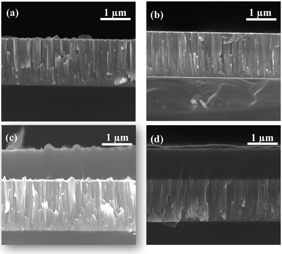 SEM images of CrC0/a-C:H and CrC30/a-C:H section coatings showed that CrC/a-C:H coatings contain a columnar CrC and an amorphous a-C:H layer (see Figure 7c,d). There is a sharp columnar/amorphous interface in the CrC0/a-C:H coating, while the a-C:H layer grew epitaxially on the CrC layer in the CrC30/a-C:H coating, which made the corresponding interface more compact [29].