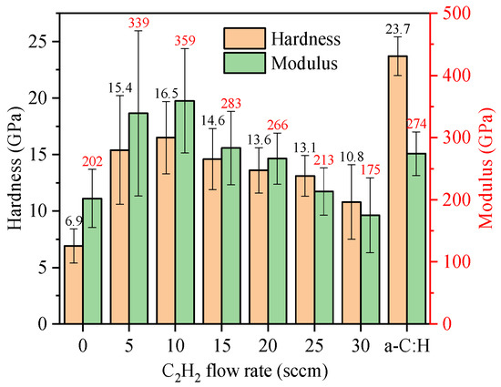 (1) The hardness and elastic modulus of the CrC coating first increased and then decreased as the C2H2 flow rate was increased. At the C2H2 flow rate equal to 10 sccm, the hardness and elastic modulus of CrC coatings were equal to 16.5 and 359 GPa, respectively.