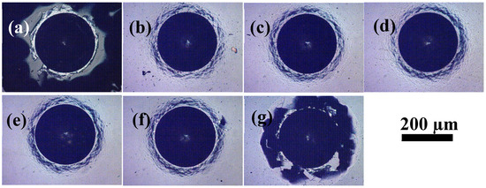 Figure 10 shows the indentation photos of the CrC/a-C:H coating, and Figure 10a–g corresponds to the CrC/a-C:H coating with a flow rate of 0, 5, 10, 15, 20, 25 and 30 sccm, respectively. In the indentation adhesion test, a diamond indenter is pressed into the coating sample, and cracks and peeling off at the edge of the indentation due to stress release are observed. According to the VDI standard 3189, indentation adhesion is divided into six grades: HF1–HF6. It can be seen from the indentation photos that there is a large area of continuous peeling along the outer edge of the indentation of CrC0/a-C:H and CrC30/a-C:H coating samples, with the adhesion grade of HF6. There is radiated fibrous peeling at the indentation of the CrC25/a-C:H coating sample, with the adhesion grade of HF3. There is spot peeling at the indentation of the CrC5/a-C:H and CrC10/a-C:H coating samples, and the adhesion grade is HF2. For the CrC15/a-C:H and CrC20/a-C:H coating samples without peeling, the adhesion grade is HF1.