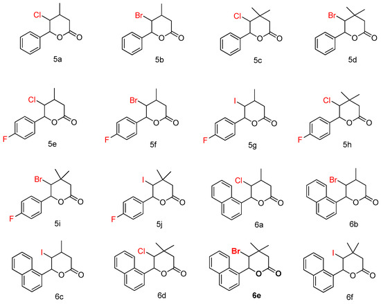 The reaction between Grignard reagents generated in situ from aryl bromides 1 and magnesium in ester solution, and crotonaldehydes 2, led to formation of vinyl alcohols 3. In the next reaction, triethyl orthoacetate was added into the solution of alcohols 3 in propionic acid and reaction mixture was heated at 138 °C to complete the Johnson–Claisen rearrangement to the respective ethyl esters, which were directly hydrolyzed using potassium hydroxide solution to give carboxylic acids 4 in an overall yield of 60%. The last halo lactonization of acids 4 with N-bromosuccinimide, N-chlorosuccinimide, or iodide in potassium iodide solution gives final halogeno-lactones 5 and 6 in 37–93% yield. The individual lactones 5 and 6 (Figure 3) were isolated via column chromatography. It is interesting to note that single δ-lactones were obtained in 37–93% yield (Table 1).