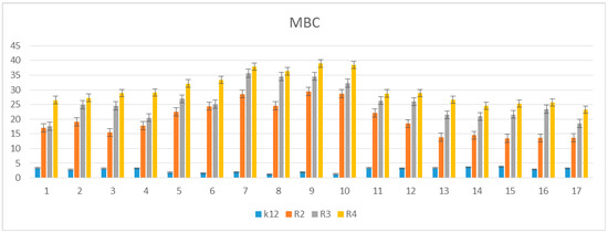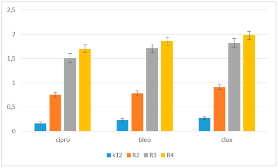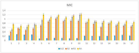 The toxicity on bacterial cells was analyzed as per previous studies according to [5]. The best MIC and MBC values among all 17 analyzed compounds were obtained for compounds marked in our study as (5e–5j 0.4–0.8 µg/mL for MIC values and 16–37 µg/mL for MBC in strains R2, R3, and R4) (Figure 4 and Figure 5). The antimicrobial activity of these lactones was determined on the basis of the MBC values for the analyzed compounds, which ranged from 30 to 40 µg/mL (Figure 5). The indicator showed an increase in the value of about 160–270 µg/mL in E. coli R2–R4 strains compared to the K12 strain, where in, due to the lack of LPS in its structure (Figure 4, Figure 5, and Figure 6), all analyzed MIC and MBC tests values were at a very low level, slightly above zero ((0.15–0.18 µg/mL for the MIC value and 1–3 µg/mL for the MBC) (Figure 4, Figure 5, and Figure 6) and (0–25 µg/mL for the MBC/MIC) (Figure 6)).