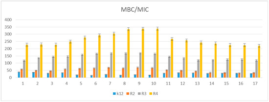MBC/MIC of the lactones in model bacterial strains. The x-axis compounds 1–17 were used sequentially. The y-axis shows the MBC/MIC value in µg/mL−1.