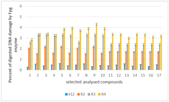 Based on the analysis of the MIC and MBC toxicity tests in the analyzed K12 and R2–R4 E. coli cells (Figure S1 in the Supplementary Materials), it was decided to modify the DNA isolated from the analyzed bacterial strains with all 17 analyzed lactones. On the basis of the obtained results of the modification, we observed that in the R4 strain, there was a change in the structure of the analyzed bacterial DNA by spontaneous change of the ccc, linear, and oc forms in relation to each other and the formation of concatamers probably responsible for bacterial DNA topoisomerases (Figure 7 and Figure S2 in the Supplementary Materials). In the bacterial DNA obtained and modified from other strains, such visible and significant changes in the structure were not observed. However, for further analysis, we used bacterial DNA isolated from all model E. coli strains. Since the effect of the Fpg protein was most pronounced in the R4 strain, we provided its example as a model and analyzed it by Tukey’s test.