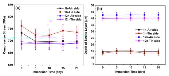 Surface CS relaxation occurs at a fast rate in the presence of water, and this is due to the lowered viscosity of the glass surface that is affected by water [18]. However, the CS results in Figure 1 show a slight decrease with different immersion times. This condition may be because the hydronium ions in the Na+-leached sites can produce new CS that superposes with the original CS produced by K+–Na+ ion exchange [13], thereby leading to an extremely small change in CS.