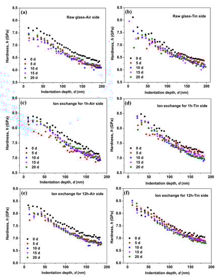 Figure 2 shows the hardness as a function of indentation depth for the air and tin sides of the raw glass and ion-exchanged glasses. Figure 2a shows significant drop in the measured hardness on the air side of the raw glass after immersion in water for different periods. However, the hardness variation on the tin side of the raw glass in Figure 2b is limited with immersion time. Figure 2c–f show the hardness variation of the ion-exchanged glasses with different ion exchange times. The results are similar to that of the raw glass. The hardness at three different indentation depths (50, 100, and 150 nm) is remeasured 6 times to quantify the hardness variation, and the results are shown in Figure 3. From Figure 3, we see that the hardness of the ion-exchanged glasses was greater than that of the raw glass. The hardness decreases first with immersion time and then increases, and this trend is similar to the raw glass and ion-exchanged glasses. The hardness reduction of the ion-exchanged glasses was less than that of the raw glass, as shown in Figure 3a,b.