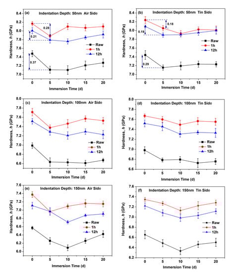 Hardness as a function of the immersion time on the air side at indentation depth of 50 nm (a), on the tin side at indentation depth of 50 nm (b), on the air side at indentation depth of 100 nm (c), on the tin side at indentation depth of 100 nm (d), on the air side at indentation depth of 150 nm (e), and on the tin side at indentation depth of 150 nm (f).