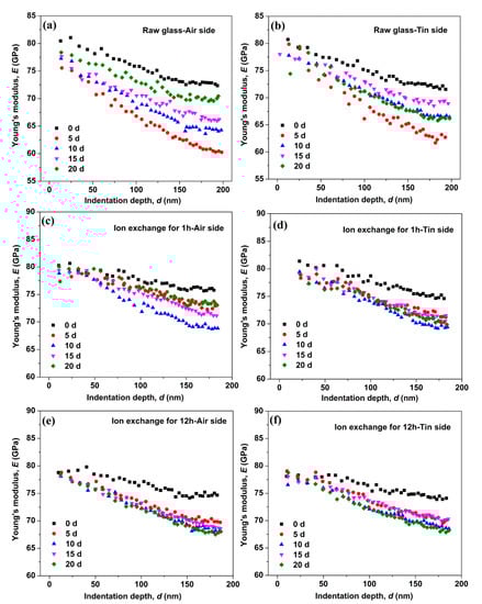 The Young’s modulus as a function of the indentation depth for the raw glass and the ion-exchanged glasses is shown in Figure 4. The Young’s modulus of the raw and ion-exchanged glasses showed a remarkable variation with immersion time. The Young’s modulus of the raw glass decreased to a minimum after immersion in water for 5 days and then recovered to different extents with the prolonging of the immersion time. The Young’s modulus of the ion-exchanged glass for 1 h decreased to a minimum after immersion in water for 10 days, and then showed some recovery with the prolonging of immersion time. For the ion-exchanged glass for 12 h, the Young’s modulus decreased to a minimum after immersion in water for 20 days. The reduction in Young’s modulus on the tin side of the raw and ion-exchanged glasses was less than that on the air side of the same glass, which is similar to the hardness results.