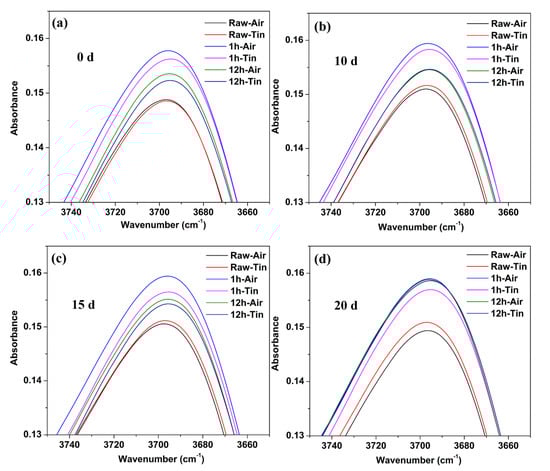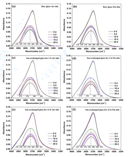 Figure 6 shows the comparison of IR spectra at 3697 cm−1 between the raw glass and ion-exchanged glasses with different immersion times. The percentage of absorbance at 3697 cm−1 for the ion-exchanged glasses was greater than that of the raw glass for the as-prepared and hydrated samples. The air side consistently showed a higher value of absorbance at 3697 cm−1 than the tin side in the raw and ion-exchanged glasses.