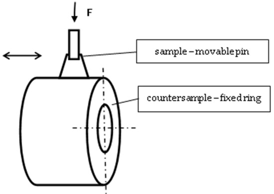The tests were performed on a pin–ring test stand (Figure 1), where the pin moved in reciprocating motion on the surface of the ring made of expanded graphite. The reciprocating motion of the pin was achieved using an eccentric mechanism.