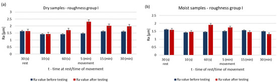 Changes in the value of the parameter Ra of steel pins for the roughness group I (Ra = 1.41–1.64 μm): (a) tests performed in dry conditions, (b) tests performed with moist graphite rings.
