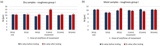 Changes in the value of the parameter Rz of steel pins for the roughness group I (Rz = 9.32–10.89 μm): (a) tests performed in dry conditions, (b) tests performed with moist graphite rings.