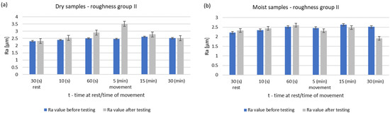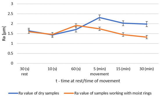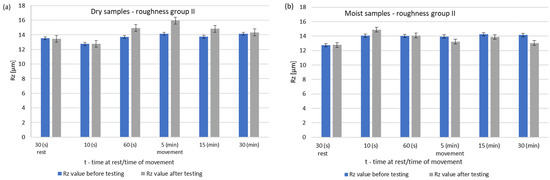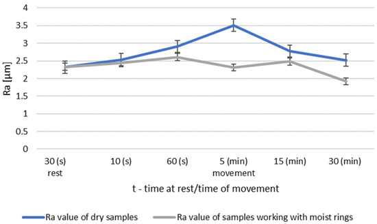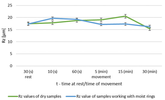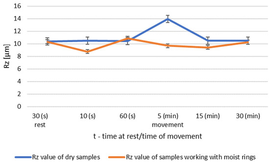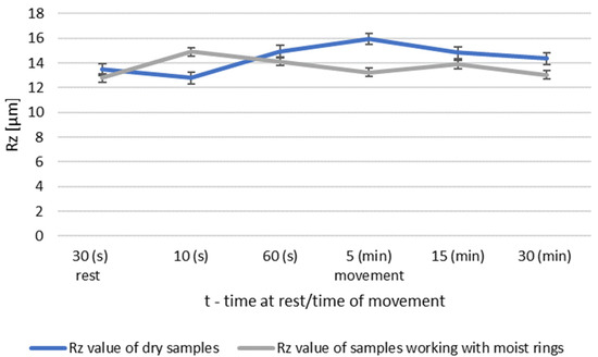 The surface tests performed for the roughness group I showed that dry operation increased the roughness of the steel samples. When the steel pins were worked with moist counter samples, the surface roughness began to decrease after 5 min of operation. The results of Ra and Rz parameters for group II roughness are shown in Figure 6 and Figure 7.