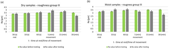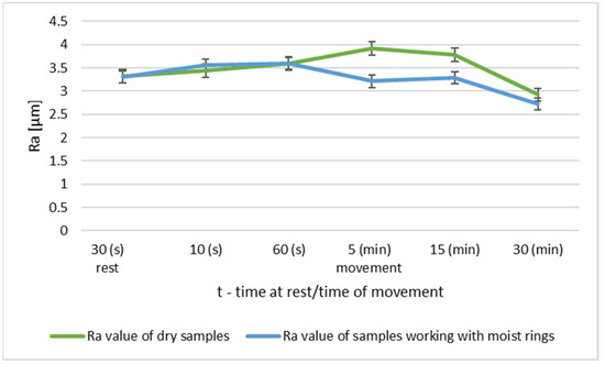 The graph (Figure 14) shows that after 30 min of operation, the initial roughness of group I increased, while for group II it reached the initial value. Group III had a decrease in roughness from the baseline value.