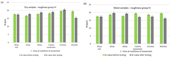 Changes in the value of the parameter Rz of steel pins for roughness group III (Rz = 17.54–19.55 μm): (a) tests performed in dry conditions, (b) tests performed with moist graphite rings.
