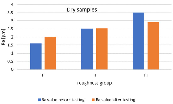 - Comparing the roughness groups selected for the study, it can be indicated that group III is the most favorable from the point of view of the formation of the sliding layer. In the case of this group, the roughness of the pins of the dry samples after 30 min of work dropped below the initial roughness. This phenomenon was not observed for groups I and II. On the other hand, the greatest decrease in the pin roughness occurred for the moist samples.
