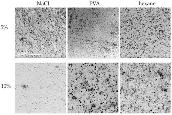 - Lin-Gibson, S.; Cooper, J.A.; Landis, F.A.; Cicerone, M.T. Systematic Investigation of Porogen Size and Content on Scaffold Morphometric Parameters and Properties. Biomacromolecules 2007, 8, 1511–1518. [Google Scholar] [CrossRef]