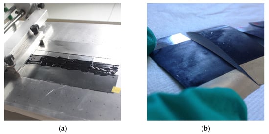 The electrodes were prepared from an ink with a weight % composition of 75/15/10 for MnO2 as active material, SG or C45 carbon black as the conductive additive part and PVDF (7 wt.%, dissolved in NMP) as the binder, respectively. During the inking process, small amounts of NMP were added and adjusted to systematically obtain a quantity of dry matter of c.a. 25 wt.% in the ink. A tape-casting method (doctor blade coating apparatus, Braive Instrument, Liège, Belgium) was used to spread the ink on an AISI 316 stainless steel foil substrate (from Goodfellow, Cambridge, UK, 25 μm thick). About 5 pieces of stainless steel (6 cm in length × 2 cm in width) have been assembled side-by-side by the back face before coating a strip of ink at the center of the five electrodes (Figure 1a). The gap between the doctor blade and the substrate was adjusted at three different wet tape thicknesses, 300 μm, 450 μm and 650 μm, in order to obtain three different active material (AM) loadings for the electrodes, respectively: a low (2–3 mgAM·cm−2), a medium (5–6 mgAM·cm−2) and a large one (10–12 mgAM·cm−2) (Figure 1b). Then, the film tape was dried at 60 °C for 1 night under vacuum for 1–2 h. Rectangular-shaped electrodes, between 2 and 3.5 cm long and 2 cm wide, were then obtained after cutting from the dry film tape. The dry film thicknesses reach 50–60 μm, 90–110 μm and 170–200 μm for low, medium and large loadings, respectively, leading to calculated porosities of 70–77%. It can be noted that the porosity of the as-prepared electrodes does not depend on the mass loading.