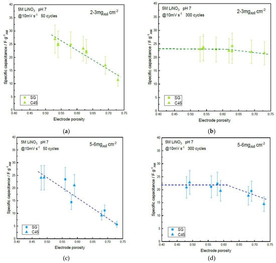Specific capacitance vs. electrode porosity of the α-MnO2 symmetric supercapacitor device using SG or C45 carbon black additive, after cycling in 5M LiNO3 at 10 mV·s−1: (a) Low-mass loading, 50 cycles; (b) Low-mass loading, 300 cycles; (c) Medium-mass loading, 50 cycles; (d) Medium-mass loading, 300 cycles; (e) Large-mass loading, 50 cycles; (f) Large-mass loading, 300 cycles. Dashed lines are guidelines for the eyes.