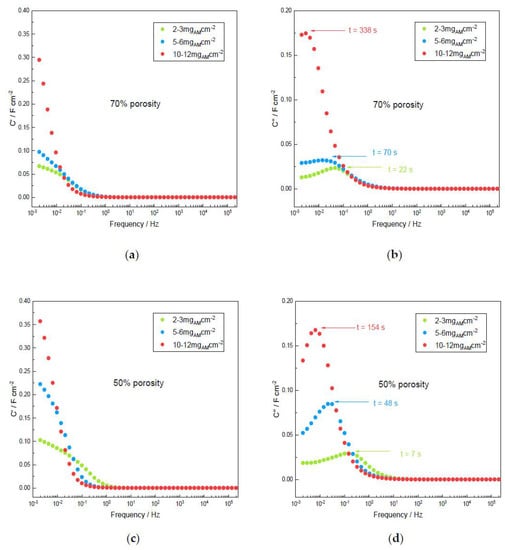 These results are confirmed in Figure 7 by Electrochemical Impedance Spectroscopy (EIS) investigated after 300 cycles at 10 mV·s−1 with the devices at ~50% and ~70% porosities and different mass loadings. The internal resistance, including the ohmic resistance, the charge transfer resistance, double-layer capacitance and the Warburg resistance systematically increases slightly after 300 cycles compared to the initial state not shown here. Obviously, Figure 7b,d show that the high-mass loading especially induces a lower internal resistance at 50% porosity with the calendering treatment compared to the 70% porosity, as shown also by the more rectangular CV observed in Figure 7c at 50% of porosity compared to the 70% porosity in Figure 7a. All the Nyquist plots exhibit an almost vertical impedance at low frequencies, characteristic of a capacitive behavior, strictly parallel for the three mass loadings at 50% porosity. This part of the Nyquist diagram determines the areal capacitance from the maximal Z” areal imaginary impedance value at the lowest frequency (f = 2 mHz), given by the equation [9]: