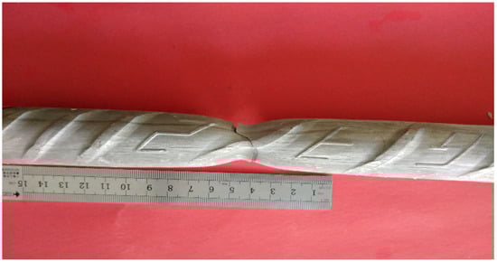 The final breaking position of the tensile specimens is different. The breaking point of some specimens is very close to the upper and lower clamps, and the breaking point of some specimens is in the middle. Through the investigation and statistics of 177 tensile samples, it is found that the sample is more likely to break near the identification symbol if there is a steel bar identification symbol in the parallel length range of the sample, as shown in Figure 1; the fracture position does not have this rule when there is no steel bar identification symbol on the sample or if the steel bar identification symbol is located in the range of the fixture.