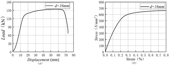 Curve diagram of a duplex stainless steel bar with a diameter of 16 mm. (a) is the load-displacement curve; (b) is the stress–strain curve.