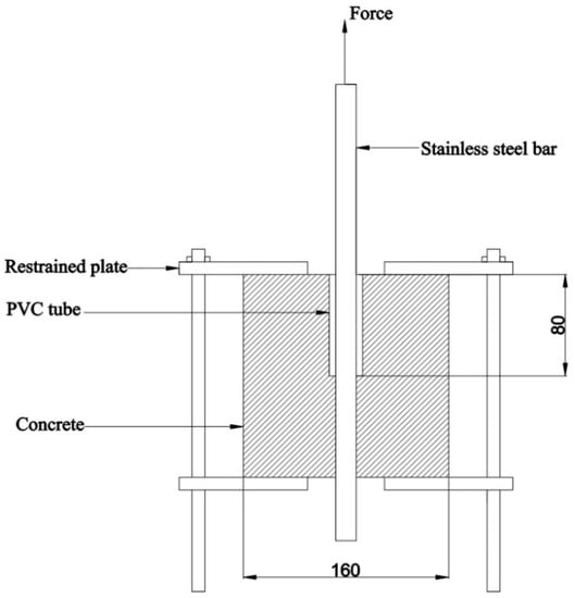 Figure 3 shows the schematic diagram of the center pullout test. The size of the concrete test block is 160 mm × 160 mm × 160 mm, and the center of the test block is equipped with steel bars, and there are three types of duplex stainless steel bars with diameters of 12 mm, 16 mm, and 25 mm. Taking the impact of local compression on the concrete at the loading end into account, a PVC casing with a diameter of 25 mm and a length of 80 mm is placed in the concrete at the loading end to form a bonding section; therefore, the bonding section between duplex stainless steel bars and concrete is 80 mm long. In addition, the stainless steel bars need to extend out of the concrete since the loading end needs to be placed with pads and loading devices.