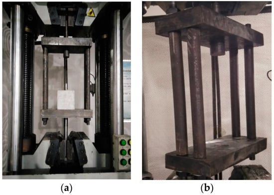 The center pull-out test was carried out on a 1000 kN Xinsansi electro-hydraulic servo testing machine, and Figure 4 shows the design test loading situation. During the test, the upper end of the reaction frame is fixed on the fixture of the testing machine, the test block is placed in the hanging basket, and the lower fixture of the testing machine clamps the duplex stainless steel bar that extends out of the test block. The speed of 100 N/s is maintained during the loading process until the end of the experiment.