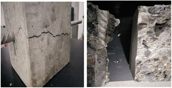 Figure 6 shows the effect of concrete splitting damage. The splitting damage specimen is loaded to the damage load, which is accompanied by a loud sound, the concrete specimen splits into two or three pieces, and then separates from the duplex stainless steel reinforcement. At this time, the force value suddenly decreased, and the test was terminated. Observing the split concrete specimen, it can be found that the convex concrete between the duplex stainless steel ribs in a small area near the loading end is sheared, and the convex concrete between the duplex stainless steel ribs in most of the bonded sections is still in.