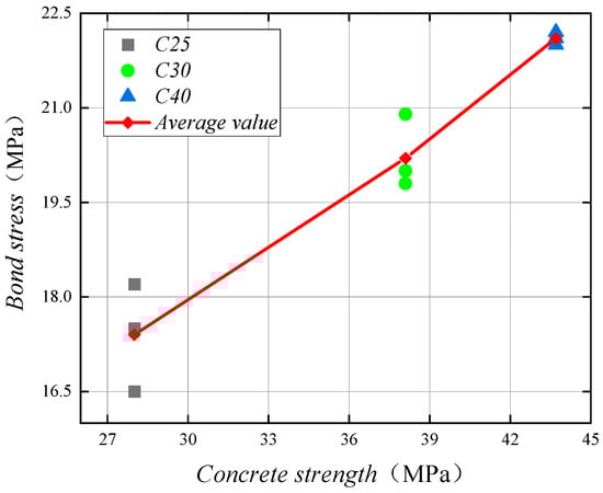 The bond stress values for the concrete strengths of C25, C30, and C40 specimens were 17.4 MPa, 20.2 MPa, and 22.1 MPa, respectively, and the compressive strengths of the cubes that were poured simultaneously with the three groups of specimens were 28 MPa, 38.1 MPa, and 43.7 MPa, respectively. Figure 7 shows the curves of the bond stresses of the specimens with the change of the compressive strength of the concrete. It is obvious that, as the compressive strength of concrete increases, the bond stress between stainless steel reinforcement and concrete also increases. From C25 to C30, the compressive strength of concrete increased by 36.1% and the bond stress increased by 16.1%; from C30 to C40, the compressive strength of concrete increased by 14.7% and the bond stress increased by 9.4%. Therefore, if other parameters are kept constant, then the bond stress between duplex stainless steel bars and concrete increases by 14% to 17% for every 10 MPa increase in concrete strength. At the same time, we found that the bond stress was well correlated with the compressive strength of concrete; this is similar to previous studies related to bond strength [].