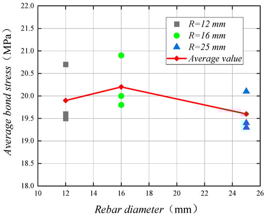 The values of bond stress for duplex stainless steel bars with diameters of 12 mm, 16 mm, and 25 mm are 19.9 MPa, 20.2 MPa, and 19.6 MPa, respectively. Figure 8 shows the curve of bond stress of the specimen with the change of duplex stainless steel bar diameter. The bond stress basically does not change when the duplex stainless steel bar diameter is from 12 mm to 16 mm, which is due to the small change in duplex stainless steel bar diameter and the influence of experimental errors, which results in slight errors between the experimental results and the theoretical study. However, the bond stress becomes smaller as the diameter of the duplex stainless steel bar becomes larger from 16 mm to 25 mm, which is the same as in previous studies []. It can be assumed that, as the diameter of the duplex stainless steel bar increases, the bond stress decreases, but the decrease is not significant.