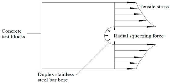 These four groups of a total of 12 specimens; out of nine specimens with pull-out damage, splitting damage only occurred in the C30R16T3.3L5 group of three specimens. During the test, the duplex stainless steel bar will produce extrusion pressure on the surrounding concrete, so that the concrete is in a state of tension, as seen in the force schematic diagram presented in Figure 9. From the surface of the duplex stainless steel bar outward to the surface of the concrete, the concrete undergoes gradual decreasing tension. The greater the thickness of the protective layer, the relatively more uniform distribution the tensile force, and the greater the tensile force can be provided. When the ratio of concrete cover to reinforcing steel diameter is 3.3, the maximum tensile force that is provided by the surrounding concrete is small, and the pulling process first reaches the concrete tensile limit, which is, the concrete splitting occurs when the duplex stainless steel bars between the ribs concrete has not been crushed. When the ratio of concrete cover to reinforcing steel diameter reaches 4.5, the maximum tensile force that is provided by the surrounding concrete increases, the pulling process of duplex stainless steel reinforcement inter-rib concrete is crushed when the concrete tensile limit state has not been reached, and pull-out damage occurs.