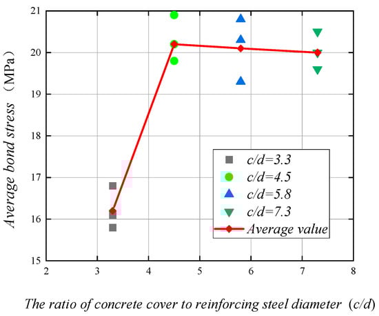 Figure 10 shows the curve of the bond stress of the specimen with the ratio of concrete cover to reinforcing steel diameter. The image shows that, when the ratio of concrete cover to reinforcing steel diameter is less than 4.5, the bond stress has not yet reached the limit value where the concrete splitting damage occurs; with the increase of the protective layer thickness, the bond stress also increases. At this time, the concrete restraint capacity is low, which leads to cracking of the concrete protection layer so the specimen is prone to splitting damage; when the ratio of concrete cover to reinforcing steel diameter is greater than 4.5, the bond stress does not increase, and it can be considered that, at this stage, increasing the protective layer thickness can no longer improve the bond stress. At this point, the concrete already has a large enough restraint, so pull-out damage occurs in the specimen.