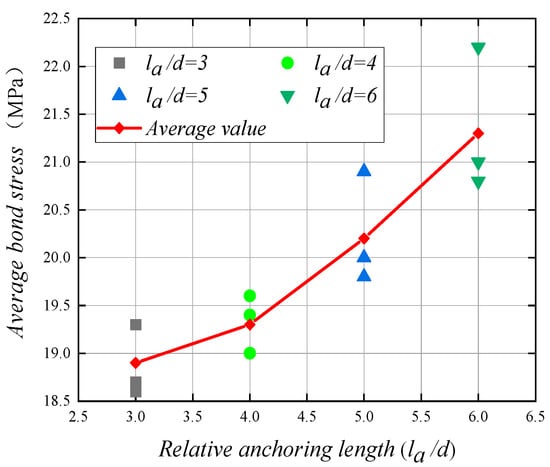 There are four groups of specimens in which the anchorage length of the duplex stainless steel reinforcement and concrete center pull-out test changes: the concrete strength is C30; the stainless steel reinforcement diameter is 16mm; the ratio of concrete cover to reinforcing steel diameter is 4.5; the bond stress values of the four groups of specimens are 18.9 MPa, 19.3 MPa, 20.2 MPa, and 21.3 MPa; and, the corresponding relative anchorage lengths are 3, 4, 5, and 6. In these four groups of a total of 12 specimens, pull-out damage occurred in all specimens. This indicates that the concrete around the duplex stainless steel reinforcement can provide a large enough tensile force to make pull-out damage occur in the specimens. Figure 11 shows the curve of bond stress with a relative anchorage length for the specimens. With the relative anchor length from 3 to 4, the bond stress increased by 2.1%; with the relative anchor length from 4 to 5, the bond stress increased by 4.7%; and, with the relative anchor length from 5 to 6, the bond stress increased by 5.4%. Obviously, with the increase of the relative anchoring length, the bonding stress between the duplex stainless steel bar and the concrete increases, and the increase is significantly improved. This experimental result is contrary to some of the literature results [,]. There are two main reasons for this: (1) when compared with ordinary steel bars, duplex stainless steel bars have higher strength, no significant yielding phase, and relatively low modulus of elasticity, which greatly enhances the bond strength with concrete; (2) the bonding stress between ordinary steel bars and concrete is unevenly distributed along the anchoring length. When the anchoring length is short, the high-stress area is relatively large, and when the anchoring length is large, the bonding stress in the anchoring area is very uneven and high-stress The area is relatively short. When compared with ordinary steel bars, the bond stress between duplex stainless steel bars and concrete is more evenly distributed along the anchoring length; when the relative anchoring length increases, the mechanical bite force between duplex stainless steel bars and concrete increases, and the bond strength increases. Accordingly, the bond stress increases [].