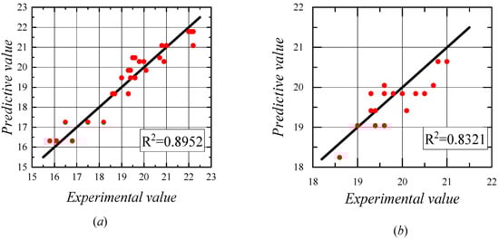 Analyzing the above regression equation, it is found that the coefficient of in the second stage equation is greater than the coefficient of in the first stage equation. This is because, in the second-stage equation, the ratio of concrete cover to reinforcing steel diameter is greater than 4.5, at this time, the ratio of concrete cover to reinforcing steel diameter change has no effect on the bond stress change, and it can be considered that the ratio of concrete cover to reinforcing steel diameter acts as ( is a constant) in the second-stage equation, through the superposition of constant coefficients, so that the coefficient in the second-stage equation is greater than the coefficient in the first-stage equation. A good correlation between the experimental and predicted values can be found by comparing the experimental and predicted values, which indicates that the expression used to evaluate the bond stress of the duplex stainless steel reinforcement predicts the experimental results with good accuracy, as shown in Figure 12. Therefore, the proposed bond stress equation for duplex stainless steel bars is considered to be accurate in predicting the bond strength.