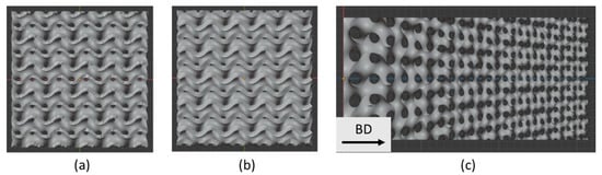Surface roughness is another critical parameter for the mechanical performance of TPMSS, especially under cyclic load [37,38]. XCT must be used to determine surface roughness in lattice structures, as no other tactile or laser technique can interrogate their interior. However, the XCT determination of the surface roughness on the curved surface is a challenging task. Therefore, we present a multistep procedure we developed to determine roughness of the walls based on the XCT data. In order to exclude the influence of building orientation and compare different specimens, only vertical walls (parallel to BD) in regions not containing the RP were analyzed. First, 2D cross-sections of the vertical walls were extracted for every specimen (Figure 11a). Then the advanced surface determination tool available in VG Studio Max [31] was employed to identify the surface of the wall. The segmented walls were then exported, and an in-house-developed Fiji ImageJ routine was used for further analysis. Wall profiles were created on both sides of the segmented walls (Figure 11a middle). To identify the base line, the profiles were processed with a low-pass filter (Figure 11a bottom represents the filtered profiles).