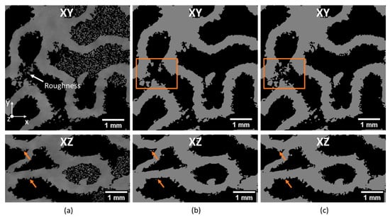 Figure 4. (a) A 2D reconstructed XY and XZ slices; (b) the result of the 2D DL segmentation of the scaffold only on XY planes; (c) the result of the combined segmentation on XY, XZ, and YZ planes. Orange boxes and arrows indicate the critical regions with surface roughness being wrongly segmented in (b).