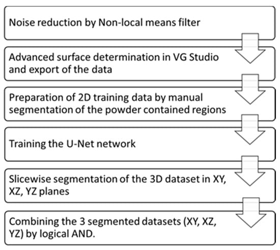 The application of the 2D network only on XY slices resulted in under-segmentation of the scaffolds surface. In this case, the surface roughness of walls parallel to the XY plane (indicated by arrows on XZ slices, Figure 4a) appears as loose powder on the XY planes and is classified by the CNN as powder (Figure 4b). To overcome this issue, the segmentation procedure of every dataset was carried out in three planes (XY, XZ and YZ), followed by the logical operation AND on the three segmented volumes (Figure 4c). As a result, the scaffold was segmented with overall accuracy exceeding 95%. The accuracy was evaluated by pixelwise comparison of the ground truth (manually segmented) with the result of DL segmentation. The workflow is presented in Figure 5.