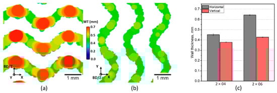 A significant difference in the thickness of horizontal and vertical walls was observed for both specimens (Figure 6c). In the 2 × 06 specimen, the vertical elements appear up to 180 µm (around 30%) thinner than the nominal WT while horizontal elements almost coincide in thickness with the nominal value.