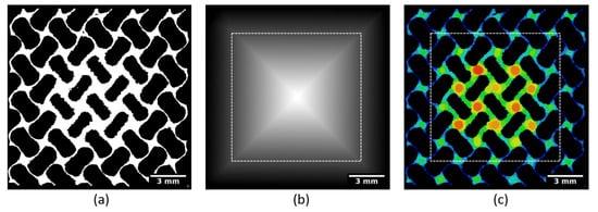 Figure 7. Schematic workflow generated for WT analysis of the gradient structures. (a) A binarized 2D slice of the 2 × 06 specimen after CE; (b) the Euclidean distance map; (c) the result of the WT analysis. The white square indicates one set of voxels having the same distance from the closest edge.