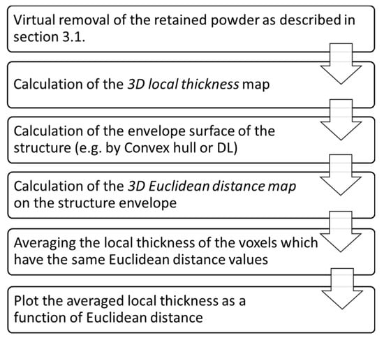 • Finally, the average value of the local thickness was calculated for every set of voxels equidistantly located from the specimen’s edges (with the same Euclidean distance value, as indicated by the white dashed line in Figure 7b,c). This combination of complementary information on the WT and the Euclidean distance allows a quantitative characterization of the WT gradient in a direction from the specimen edges to the center. Figure 8 summarizes the workflow.