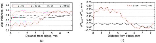 Figure 9. (a) WT as a function of distance to the edges; (b) the difference between as-build (PRS) and CE WT as a function of distance to the edges.