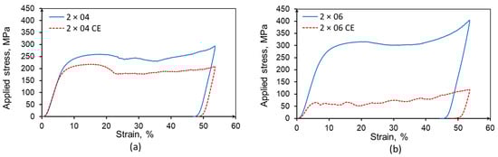 Figure 10. Stress–strain curves obtained during compression tests on 2 × 04 (a) and 2 × 06 (b) specimens in as-build condition and after CE.