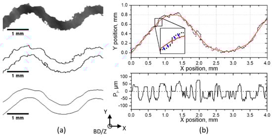 Figure 11. Evaluation of the surface roughness. (a) A 2D cross-section extracted from the vertical wall of 2 × 04 specimen (top), the profiles of both sides of the wall (middle), the profiles after low-pass filtering (bottom); (b) example showing the original (black points) and filtered profiles (continuous red line) and the resulting roughness profile (bottom). BD indicates the build direction (normal to the layer surfaces).