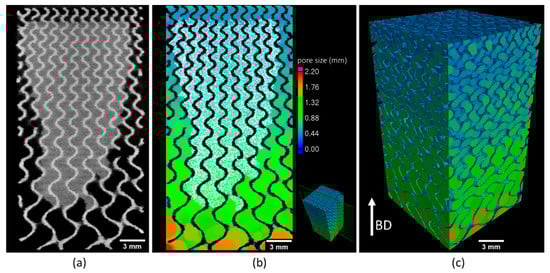 Figure 12. (a) 2D slice of a 3D reconstruction of a FGPS structure; (b) 2D slice showing the result of 3D pore size analysis (the white area represents the entrapped powder particles); (c) 3D rendering of the pore size distribution along the build direction (BD).