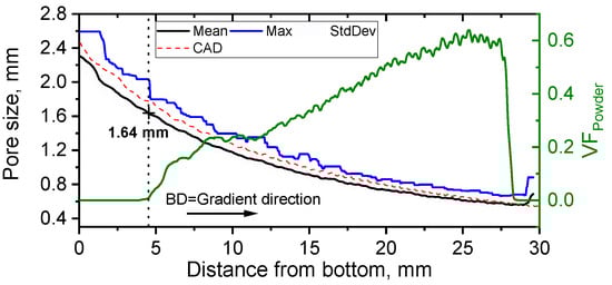As mentioned above, one of the approaches to mimic the bone structure is the manufacture of functionally graded porous structures along a particular direction. In this case, the problem of RP is also present and needs to be considered when optimizing the size of the smallest pore (see Figure 12). A FGPS specimen with a porosity gradient in the build direction was investigated, combining the approaches described above. The pore size distribution was analyzed in the direction of the gradient.