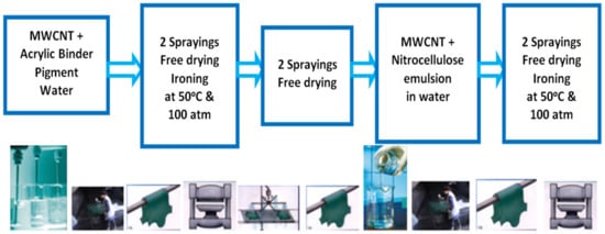 Different concentrations of MWCNT, from 0.25% to 0.7% (% reported to film forming composite weight) were dispersed in acrylic and nitrocellulose-based polymers by using ultrasound stirring at 280 W and 50 Hz (ultrasonic bath, Elma S30H, Singen, Germany) for 15 min. The range of MWCNT concentrations was selected to avoid spray gun occlusion and to use the lowest quantity for maximum conductive effect without damaging the leather surface properties. Multifunctional properties were identified in order to add economic efficiency to the new approach. The trials for MWCNT pre-processing by ultrasound or ball-milling (not presented here) showed that the use of MWCNTs, as they are, is the most efficient route for the development of conductive and multifunctional properties.